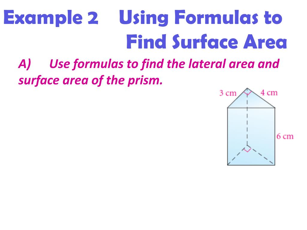 Example 2 Using Formulas to Find Surface Area A) Use formulas to find the lateral area and surface area of the prism.