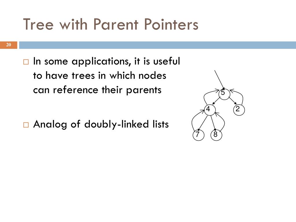 Tree with Parent Pointers • In some applications, it is useful to have trees in which nodes can reference their parents • Analog of doubly-linked lists 5 4 2 8 7