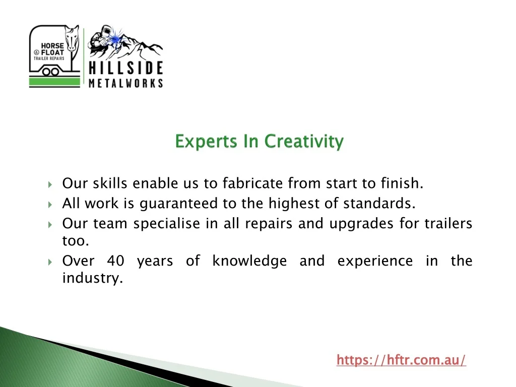 Experts In Creativity • Our skills enable us to fabricate from start to finish. • All work is guaranteed to the highest of standards. • Our team specialise in all repairs and upgrades for trailers too. • Over 40 years of knowledge and experience in the industry. https://hftr.com.au/