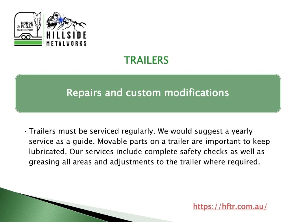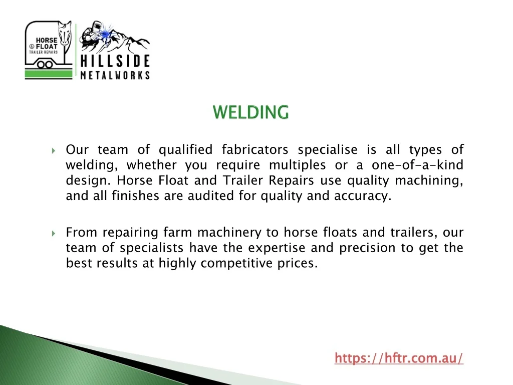 WELDING • Our team of qualified fabricators specialiseis all types of welding, whether you require multiples or a one-of-a-kind design. Horse Float and Trailer Repairs use quality machining, and all finishes are audited for quality and accuracy. • From repairing farm machinery to horse floats and trailers, our team of specialists have the expertise and precision to get the best results at highly competitive prices. https://hftr.com.au/