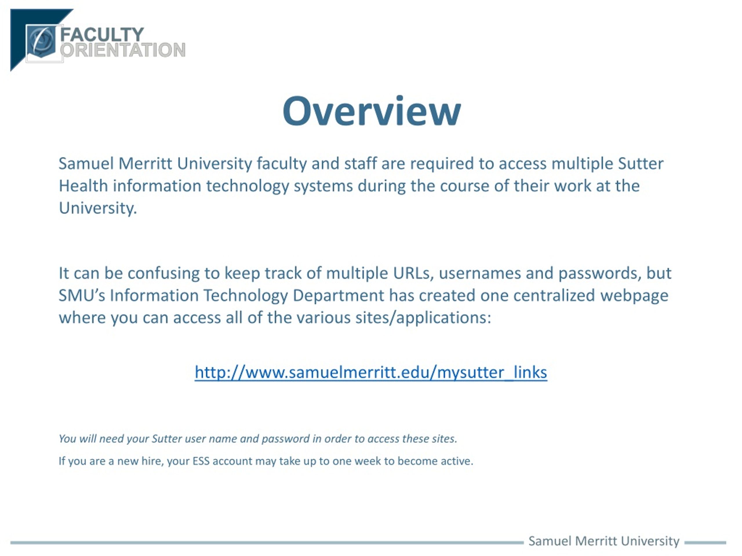 Overview Samuel Merritt University faculty and staff are required to access multiple Sutter Health information technology systems during the course of their work at the University. It can be confusing to keep track of multiple URLs, usernames and passwords, but SMU’s Information Technology Department has created one centralized webpage where you can access all of the various sites/applications: http://www.samuelmerritt.edu/mysutter_links You will need your Sutter user name and password in order to access these sites.If you are a new hire, your ESS account may take up to one week to become active.