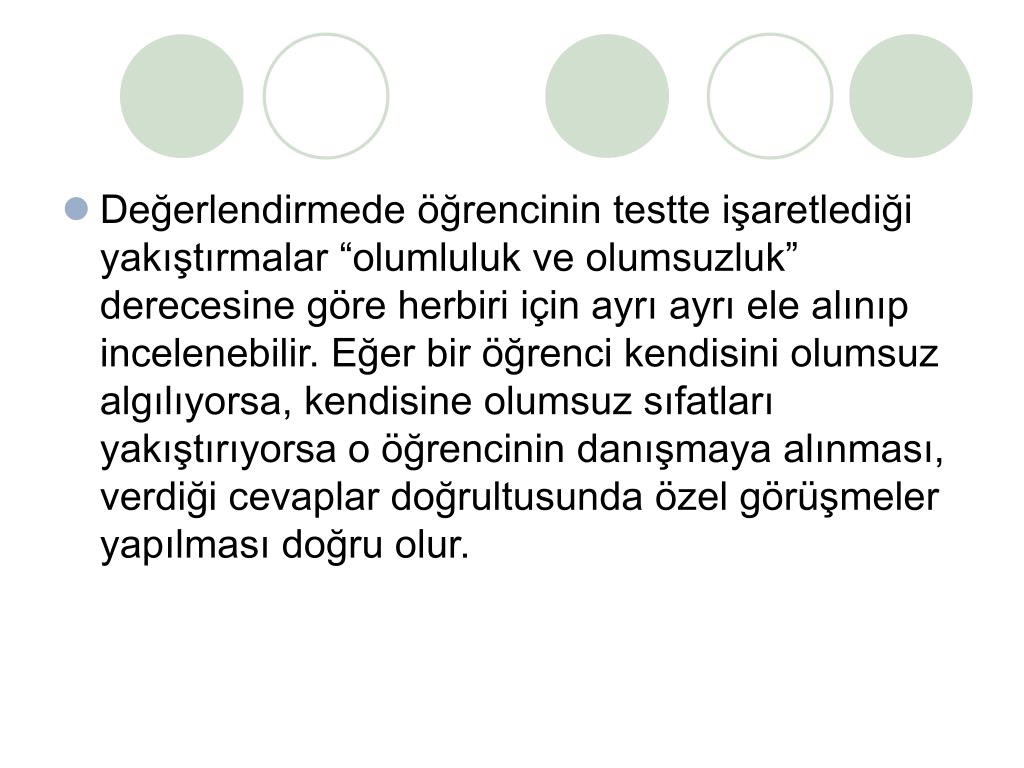 Değerlendirmede öğrencinin testte işaretlediği yakıştırmalar “olumluluk ve olumsuzluk” derecesine göre herbiri için ayrı ayrı ele alınıp incelenebilir. Eğer bir öğrenci kendisini olumsuz algılıyorsa, kendisine olumsuz sıfatları yakıştırıyorsa o öğrencinin danışmaya alınması, verdiği cevaplar doğrultusunda özel görüşmeler yapılması doğru olur.