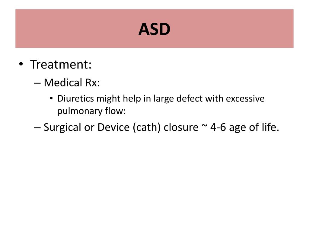ASD • Treatment: • Medical Rx: • Diuretics might help in large defect with excessive pulmonary flow: • Surgical or Device (cath) closure ~ 4-6 age of life.