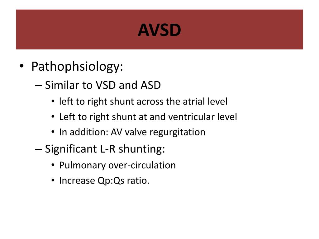 AVSD • Pathophsiology: • Similar to VSD and ASD • left to right shunt across the atrial level • Left to right shunt at and ventricular level • In addition: AV valve regurgitation • Significant L-R shunting: • Pulmonary over-circulation • Increase Qp:Qs ratio.