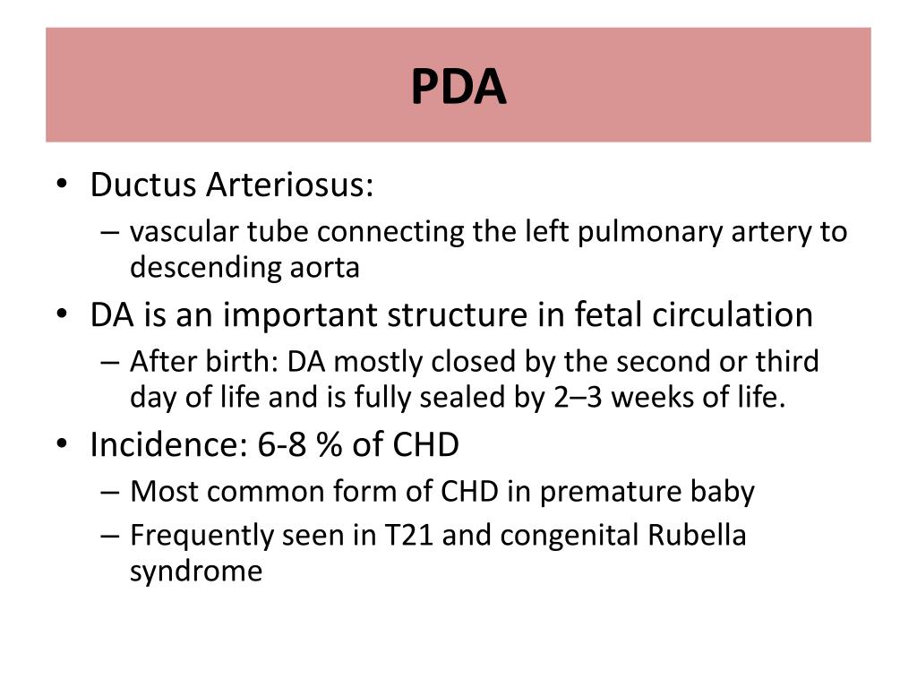 PDA • DuctusArteriosus: • vascular tube connecting the left pulmonary artery to descending aorta • DA is an important structure in fetal circulation • After birth: DA mostly closed by the second or third day of life and is fully sealed by 2–3 weeks of life. • Incidence: 6-8 % of CHD • Most common form of CHD in premature baby • Frequently seen in T21 and congenital Rubella syndrome
