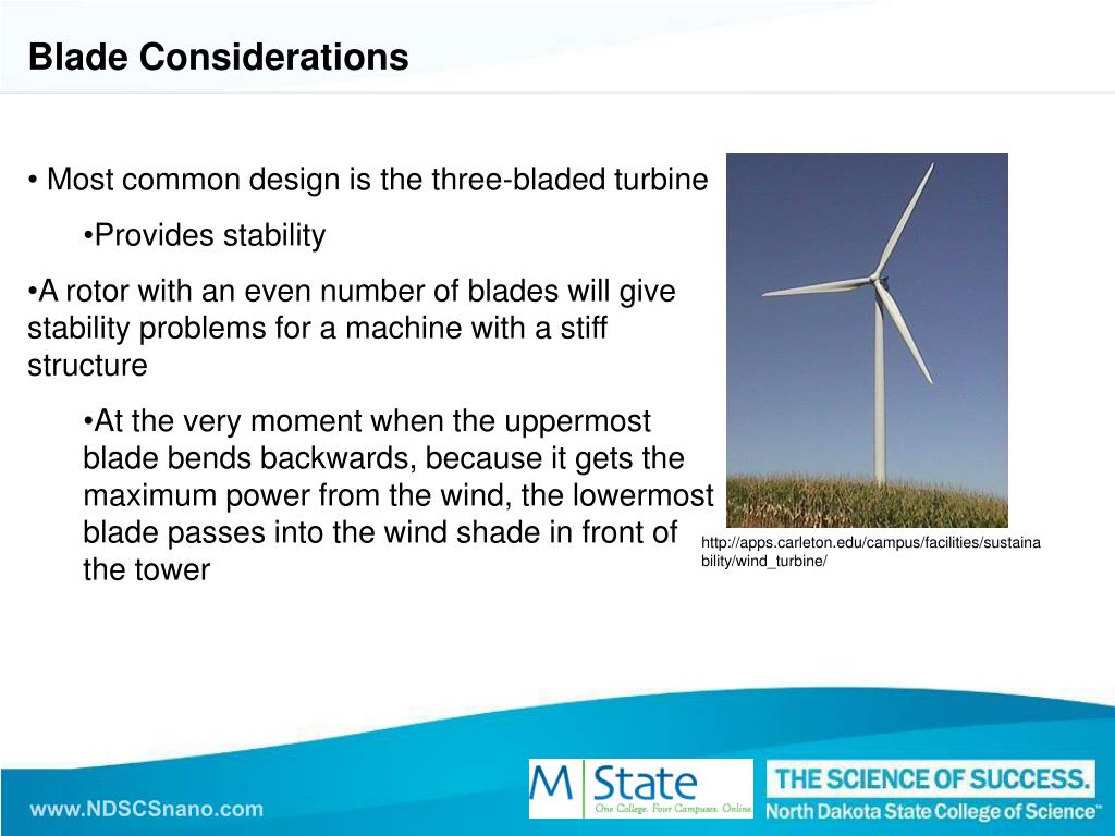 Blade Considerations • Most common design is the three-bladed turbine • Provides stability • A rotor with an even number of blades will give stability problems for a machine with a stiff structure • At the very moment when the uppermost blade bends backwards, because it gets the maximum power from the wind, the lowermost blade passes into the wind shade in front of the tower http://apps.carleton.edu/campus/facilities/sustainability/wind_turbine/