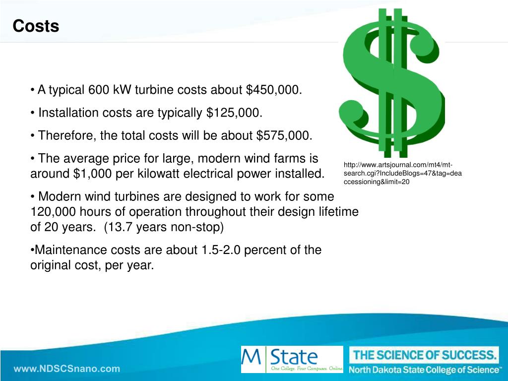 Costs • A typical 600 kW turbine costs about $450,000. • Installation costs are typically $125,000. • Therefore, the total costs will be about $575,000. • The average price for large, modern wind farms is around $1,000 per kilowatt electrical power installed. • Modern wind turbines are designed to work for some 120,000 hours of operation throughout their design lifetime of 20 years. (13.7 years non-stop) • Maintenance costs are about 1.5-2.0 percent of the original cost, per year. http://www.artsjournal.com/mt4/mt-search.cgi?IncludeBlogs=47&tag=deaccessioning&limit=20