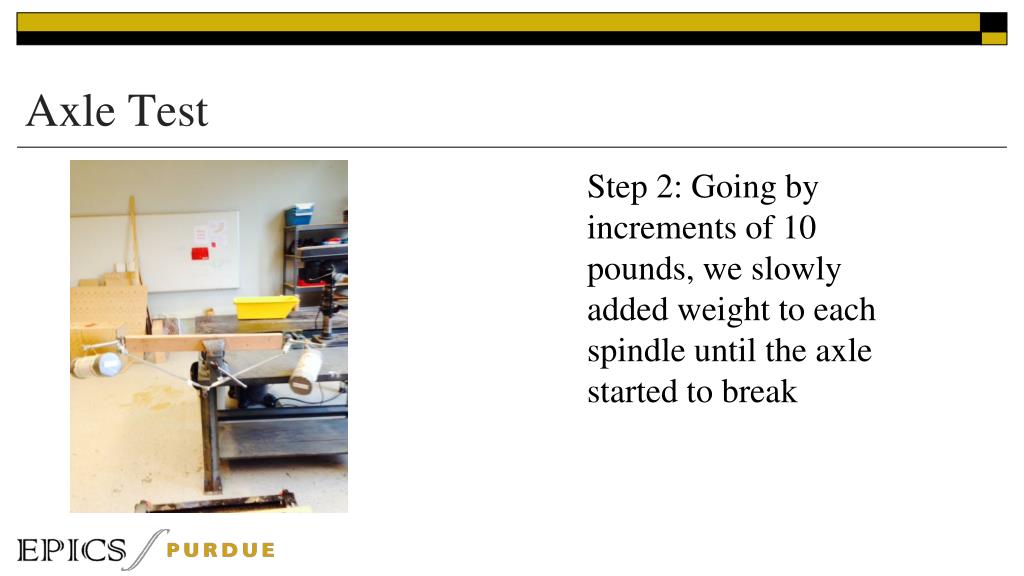 Axle Test Step 2: Going by increments of 10 pounds, we slowly added weight to each spindle until the axle started to break