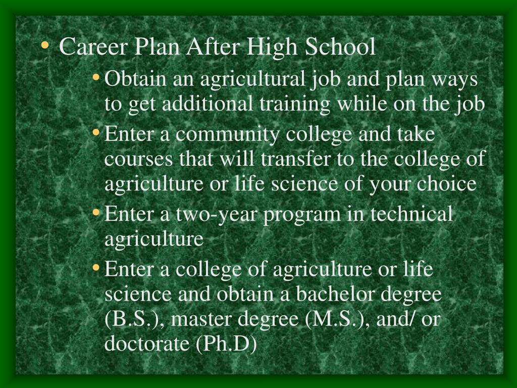 Career Plan After High School • Obtain an agricultural job and plan ways to get additional training while on the job • Enter a community college and take courses that will transfer to the college of agriculture or life science of your choice • Enter a two-year program in technical agriculture • Enter a college of agriculture or life science and obtain a bachelor degree (B.S.), master degree (M.S.), and/ or doctorate (Ph.D)