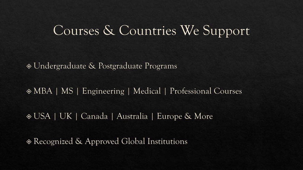 Courses & Countries We Support • Undergraduate & Postgraduate Programs • MBA | MS | Engineering | Medical | Professional Courses • USA | UK | Canada | Australia | Europe & More • Recognized & Approved Global Institutions