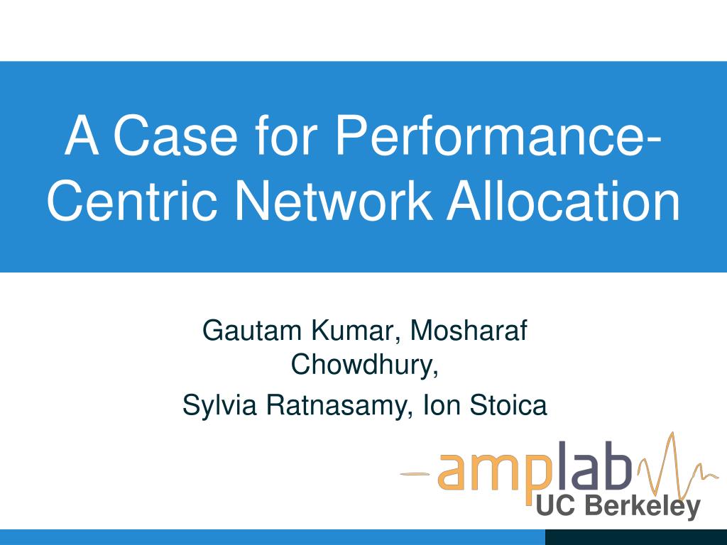 A Case for Performance-Centric Network Allocation Gautam Kumar, MosharafChowdhury, Sylvia Ratnasamy, Ion Stoica UC Berkeley UC Berkeley UC Berkeley UC Berkeley