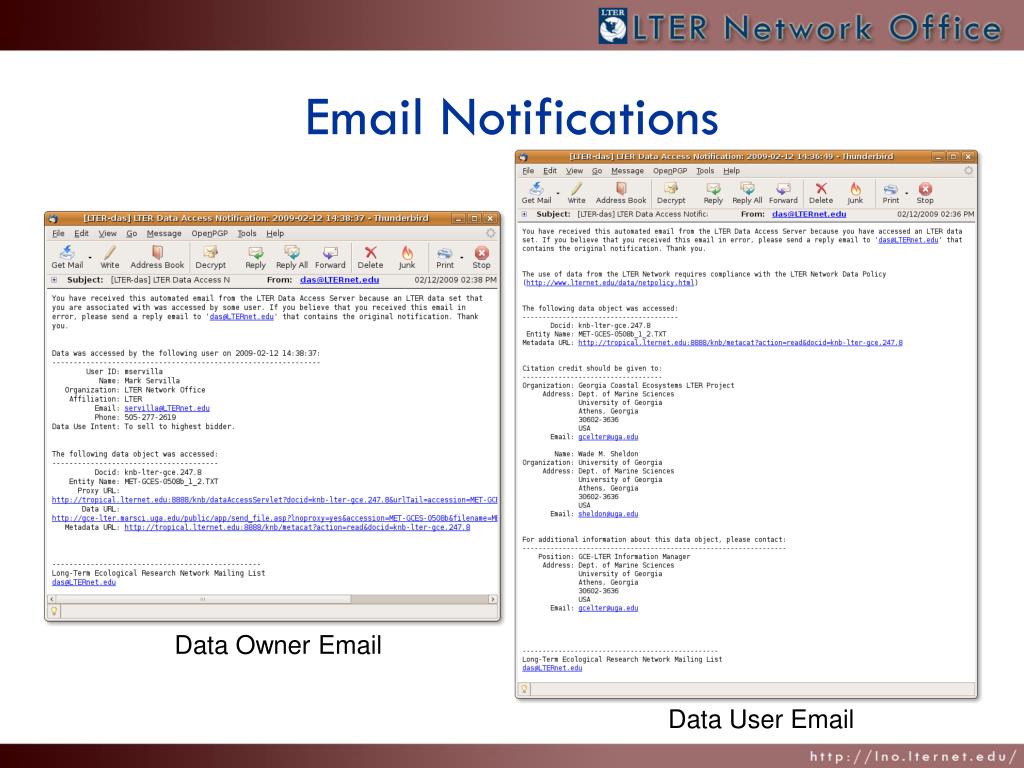 User Registration & Authentication Separate user table for registration specific information, including statement of intended use (all users) Authentication LTER LDAP Local pass-phrase challenge for non-LTER users Supports “cookies” for automatic login By-pass for 3rd party applications (e.g. Kepler) Filter for “search bots” or “web spiders”