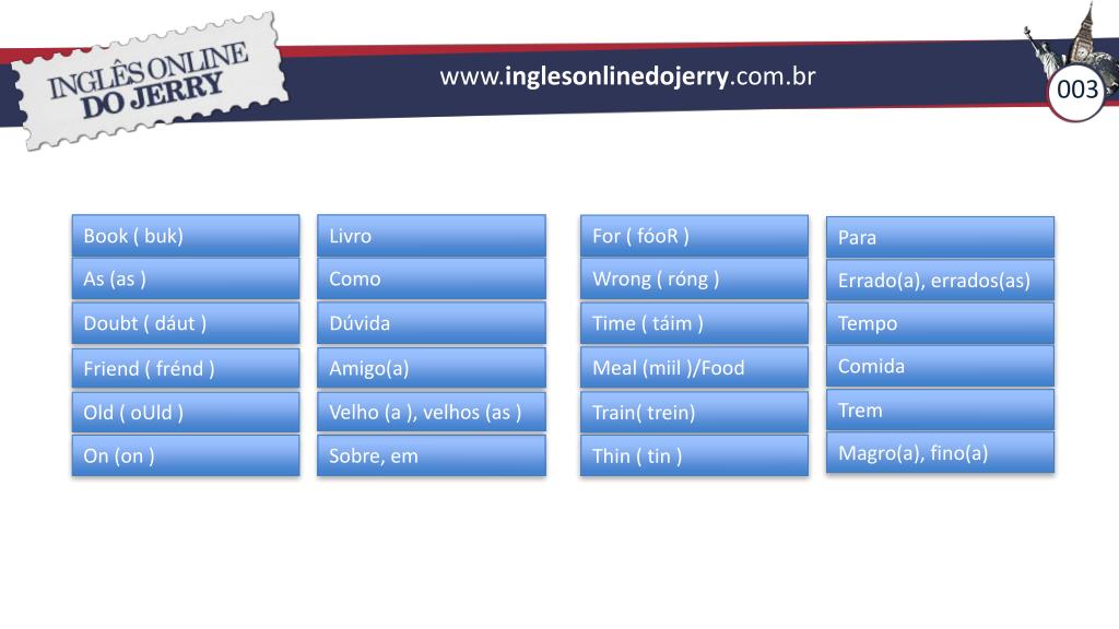 www.inglesonlinedojerry.com.br 003 Book ( buk) Livro For ( fóoR ) Para As (as ) Como Wrong ( róng ) Errado(a), errados(as) Dúvida Doubt ( dáut ) Time ( táim ) Tempo Comida Meal (miil )/Food Amigo(a) Friend ( frénd ) Trem Train( trein) Old ( oUld ) Velho (a ), velhos (as ) Magro(a), fino(a) Sobre, em On (on ) Thin( tin)