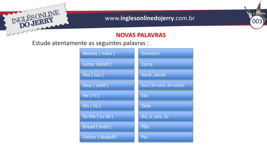 www.inglesonlinedojerry.com.br 003 NOVAS PALAVRAS Estude atentamente as seguintes palavras : Money ( mâni ) Dinheiro Letter (léteR ) Carta Você ,vocês You ( iúu ) Seu ( de você, de vocês) Your ( ióAR ) He ( ríi ) Ele His ( rís ) Dele To the ( tu dii ) Ao, à ,aos, às Bread ( bréd ) Pão Father ( fáadeR) Pai