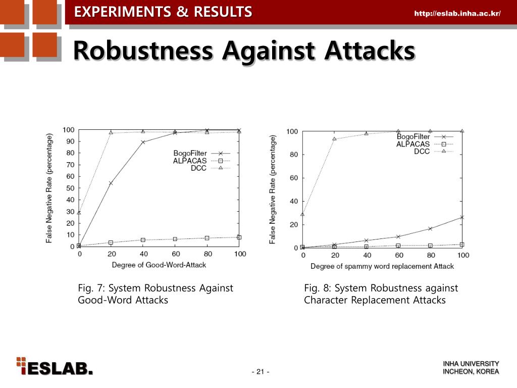 EXPERIMENTS & RESULTS Robustness Against Attacks Fig. 7: System Robustness Against Good-Word Attacks Fig. 8: System Robustness against Character Replacement Attacks