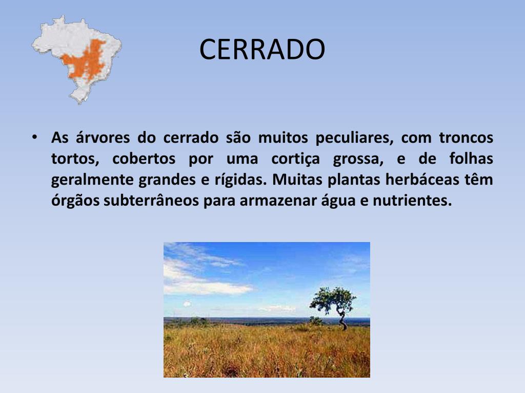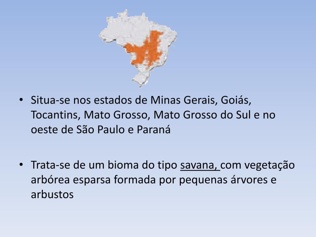 Situa-se nos estados de Minas Gerais, Goiás, Tocantins, Mato Grosso, Mato Grosso do Sul e no oeste de São Paulo e Paraná • Trata-se de um bioma do tipo savana, com vegetação arbórea esparsa formada por pequenas árvores e arbustos