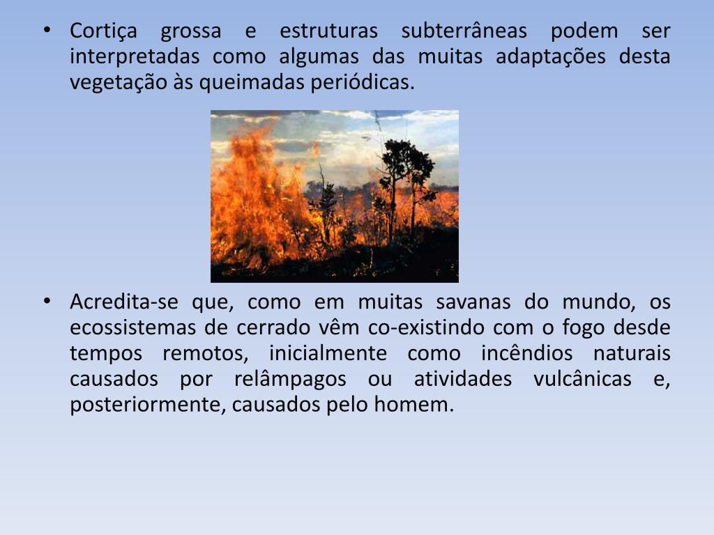 Cortiça grossa e estruturas subterrâneas podem ser interpretadas como algumas das muitas adaptações desta vegetação às queimadas periódicas. • Acredita-se que, como em muitas savanas do mundo, os ecossistemas de cerrado vêm co-existindo com o fogo desde tempos remotos, inicialmente como incêndios naturais causados por relâmpagos ou atividades vulcânicas e, posteriormente, causados pelo homem.