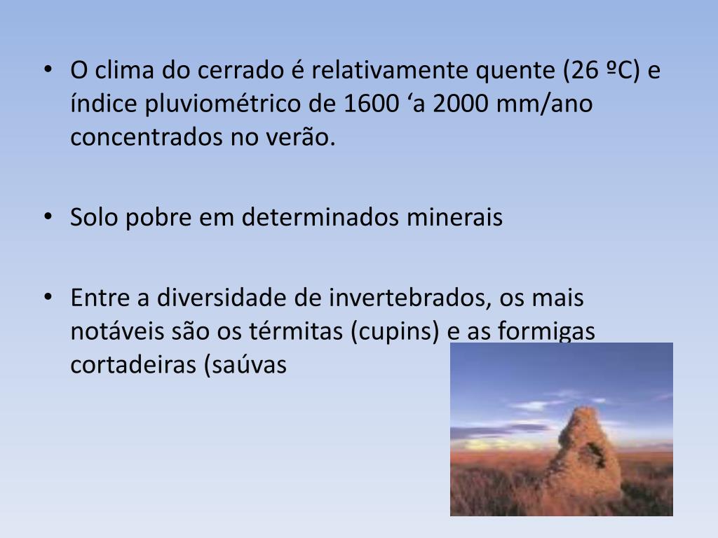 O clima do cerrado é relativamente quente (26 ºC) e índice pluviométrico de 1600 ‘a 2000 mm/ano concentrados no verão. • Solo pobre em determinados minerais • Entre a diversidade de invertebrados, os mais notáveis são os térmitas (cupins) e as formigas cortadeiras (saúvas