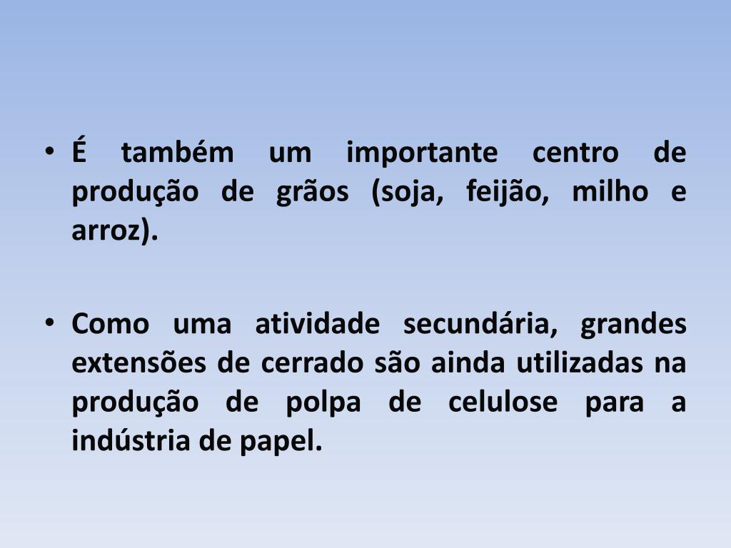 É também um importante centro de produção de grãos (soja, feijão, milho e arroz). • Como uma atividade secundária, grandes extensões de cerrado são ainda utilizadas na produção de polpa de celulose para a indústria de papel.