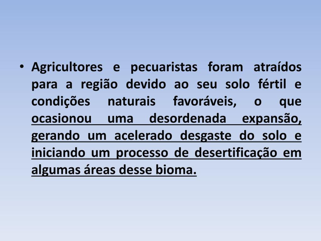 Agricultores e pecuaristas foram atraídos para a região devido ao seu solo fértil e condições naturais favoráveis, o que ocasionou uma desordenada expansão, gerando um acelerado desgaste do solo e iniciando um processo de desertificação em algumas áreas desse bioma.