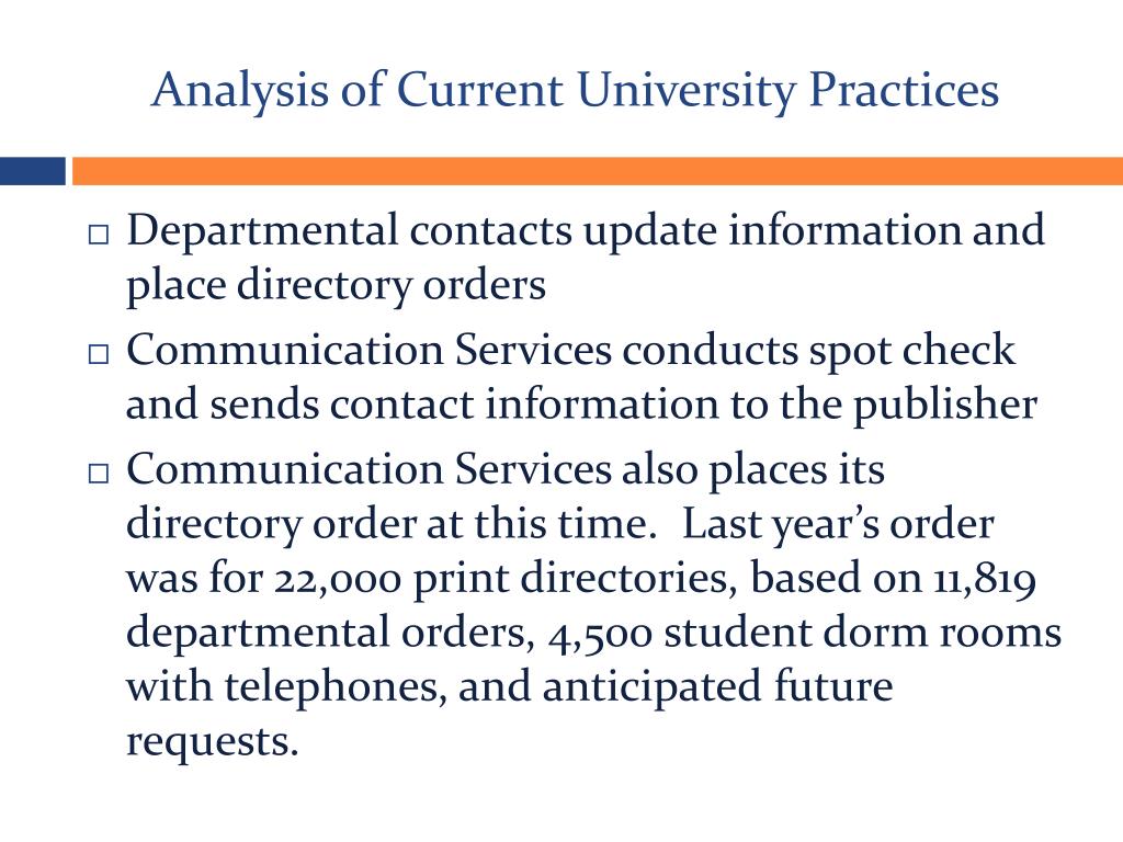 Analysis of Current University Practices • Departmental contacts update information and place directory orders • Communication Services conducts spot check and sends contact information to the publisher • Communication Services also places its directory order at this time. Last year’s order was for 22,000 print directories, based on 11,819 departmental orders, 4,500 student dorm rooms with telephones, and anticipated future requests.
