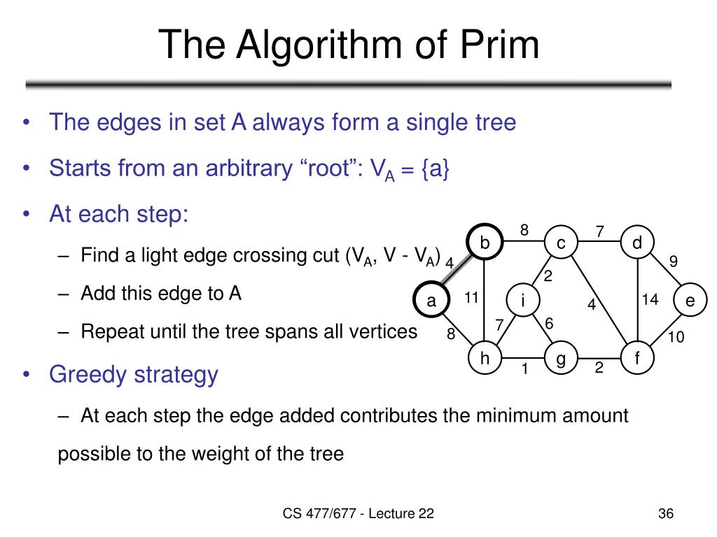 8 7 b c d 9 4 2 a e i 11 14 4 6 7 8 10 h g f 2 1 The Algorithm of Prim • The edges in set A always form a single tree • Starts from an arbitrary “root”: VA = {a} • At each step: • Find a light edge crossing cut (VA, V - VA) • Add this edge to A • Repeat until the tree spans all vertices • Greedy strategy • At each step the edge added contributes the minimum amount possible to the weight of the tree CS 477/677 - Lecture 22