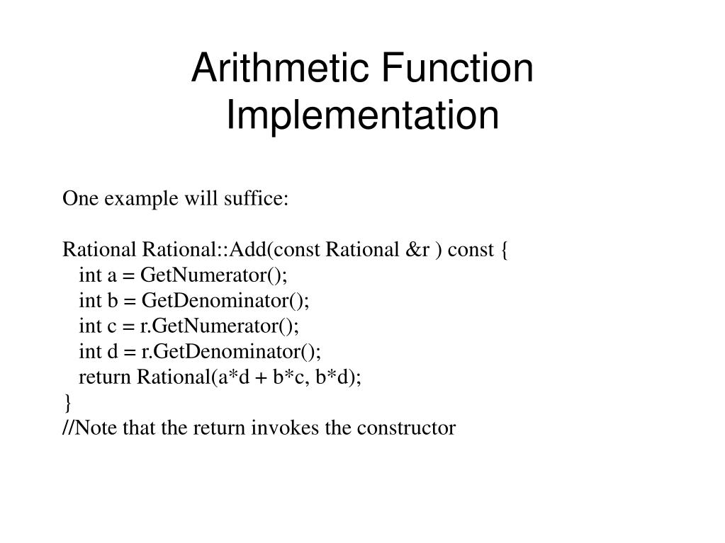 Arithmetic Function Implementation One example will suffice: Rational Rational::Add(const Rational &r ) const { int a = GetNumerator(); int b = GetDenominator(); int c = r.GetNumerator(); int d = r.GetDenominator(); return Rational(a*d + b*c, b*d); } //Note that the return invokes the constructor