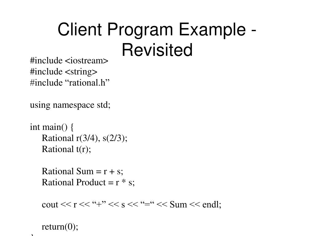Client Program Example - Revisited #include <iostream> #include <string> #include “rational.h” using namespace std; int main() { Rational r(3/4), s(2/3); Rational t(r); Rational Sum = r + s; Rational Product = r * s; cout << r << “+” << s << “=“ << Sum << endl; return(0); }