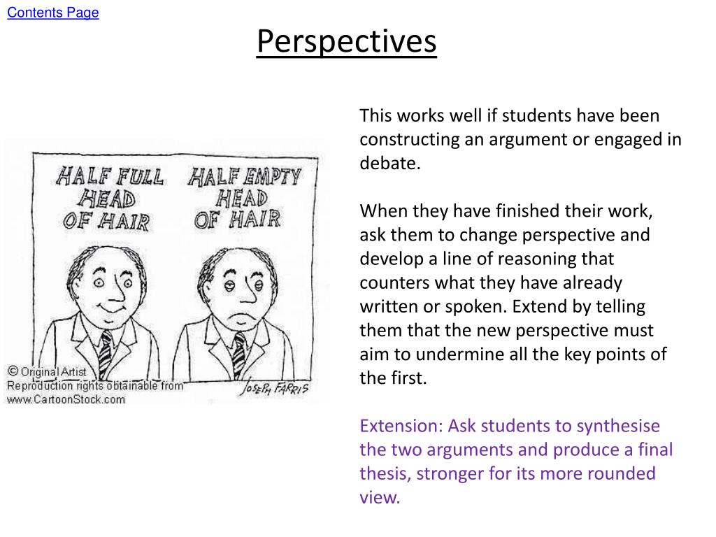 Contents Page Perspectives This works well if students have been constructing an argument or engaged in debate. When they have finished their work, ask them to change perspective and develop a line of reasoning that counters what they have already written or spoken. Extend by telling them that the new perspective must aim to undermine all the key points of the first. Extension: Ask students to synthesise the two arguments and produce a final thesis, stronger for its more rounded view.