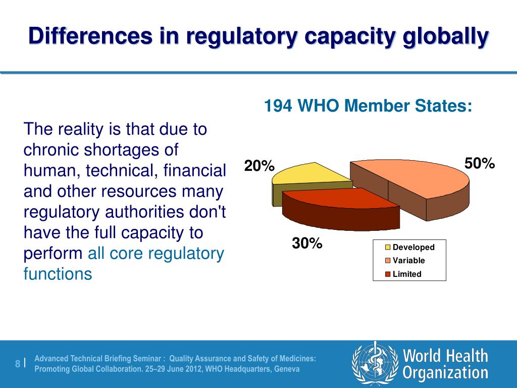 Differences in regulatory capacity globally 194 WHO Member States: The reality is that due to chronic shortages of human, technical, financial and other resources many regulatory authorities don't have the full capacity to perform all core regulatory functions