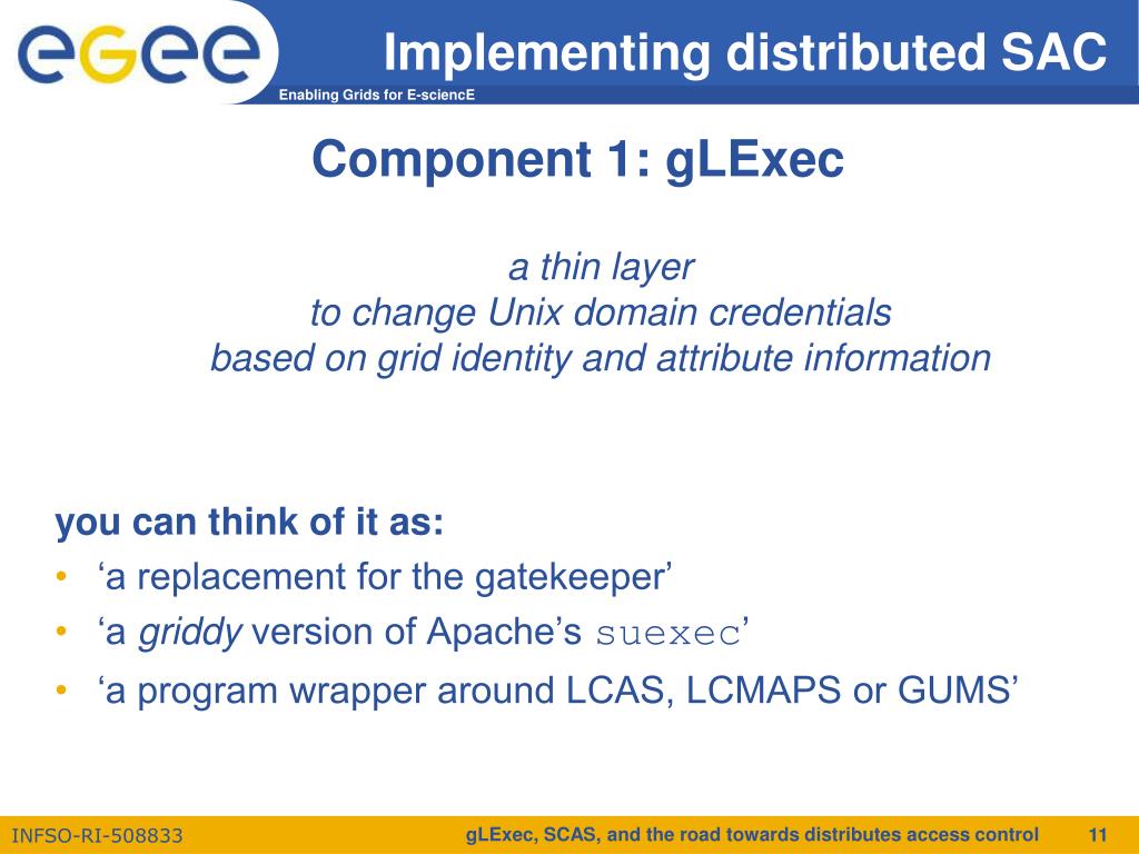 Implementing distributed SAC Component 1: gLExec a thin layerto change Unix domain credentialsbased on grid identity and attribute information you can think of it as: • ‘a replacement for the gatekeeper’ • ‘a griddy version of Apache’s suexec’ • ‘a program wrapper around LCAS, LCMAPS or GUMS’ gLExec, SCAS, and the road towards distributes access control