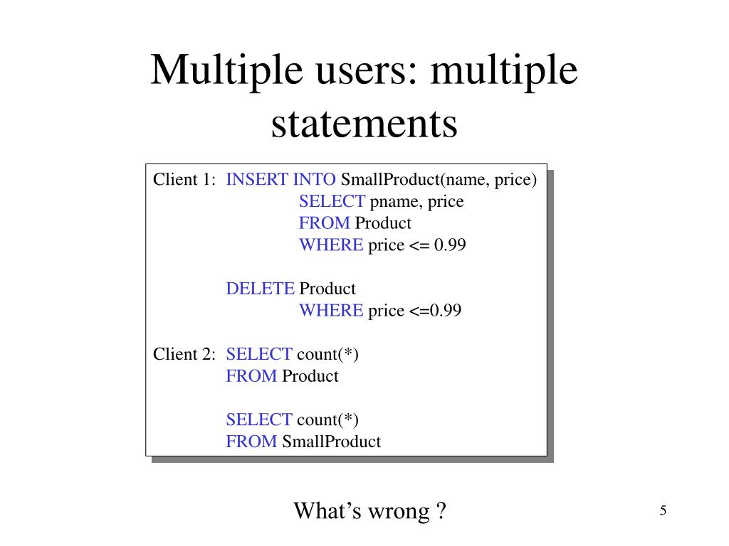 Multiple users: multiple statements Client 1: INSERT INTO SmallProduct(name, price)SELECT pname, priceFROM Product WHERE price <= 0.99 DELETE ProductWHERE price <=0.99Client 2: SELECT count(*)FROM ProductSELECT count(*)FROM SmallProduct What’s wrong ?