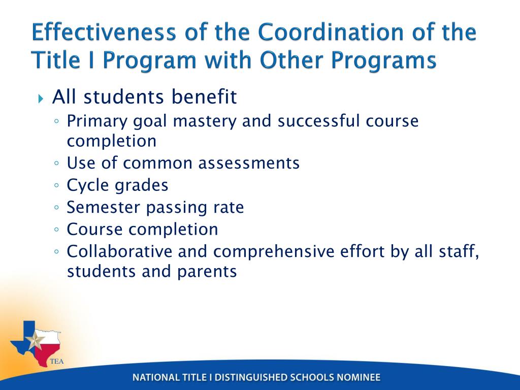 Effectiveness of the Coordination of the Title I Program with Other Programs • All students benefit • Primary goal mastery and successful course completion • Use of common assessments • Cycle grades • Semester passing rate • Course completion • Collaborative and comprehensive effort by all staff, students and parents