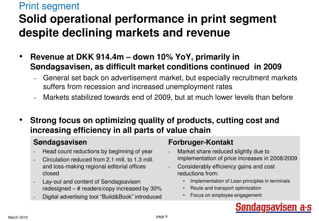 Print segment Solid operational performance in print segment despite declining markets and revenue • Revenue at DKK 914.4m – down 10% YoY, primarily in Søndagsavisen, as difficult market conditions continued in 2009 • General set back on advertisement market, but especially recruitment markets suffers from recession and increased unemployment rates • Markets stabilized towards end of 2009, but at much lower levels than before • Strong focus on optimizing quality of products, cutting cost and increasing efficiency in all parts of value chain • Søndagsavisen • Head count reductions by beginning of year • Circulation reduced from 2.1 mill. to 1.3 mill. and loss-making regional editorial offices closed • Lay-out and content of Søndagsavisen redesigned – # readers/copy increased by 30% • Digital advertising tool “Build&Book” introduced • Forbruger-Kontakt • Market share reduced slightly due to implementation of price increases in 2008/2009 • Considerably efficiency gains and cost reductions from: • Implementation of Lean principles in terminals • Route and transport optimization • Focus on employee engagement