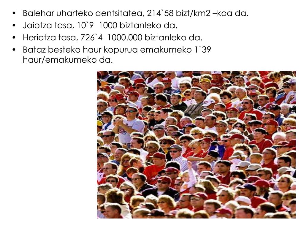 Balehar uharteko dentsitatea, 214`58 bizt/km2 –koa da. • Jaiotza tasa, 10`9 1000 biztanleko da. • Heriotza tasa, 726`4 1000.000 biztanleko da. • Bataz besteko haur kopurua emakumeko 1`39 haur/emakumeko da.