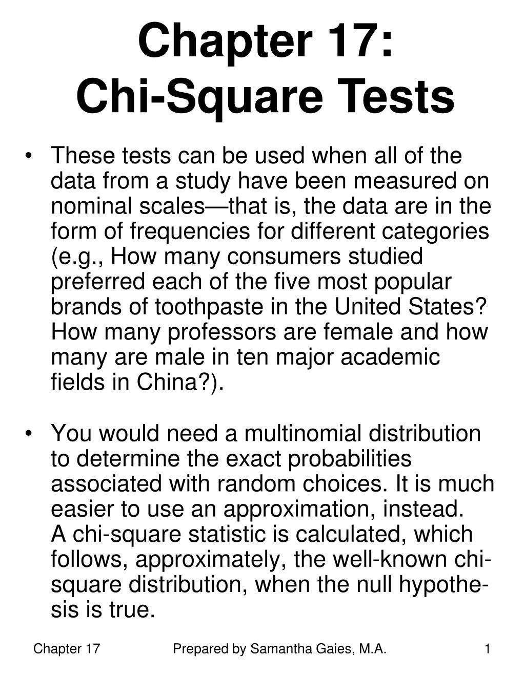 Chapter 17: Chi-Square Tests • These tests can be used when all of the data from a study have been measured on nominal scales—that is, the data are in the form of frequencies for different categories (e.g., How many consumers studied preferred each of the five most popular brands of toothpaste in the United States? How many professors are female and how many are male in ten major academic fields in China?). • You would need a multinomial distribution to determine the exact probabilities associated with random choices. It is much easier to use an approximation, instead. A chi-square statistic is calculated, which follows, approximately, the well-known chi-square distribution, when the null hypothe-sis is true. Prepared by Samantha Gaies, M.A.