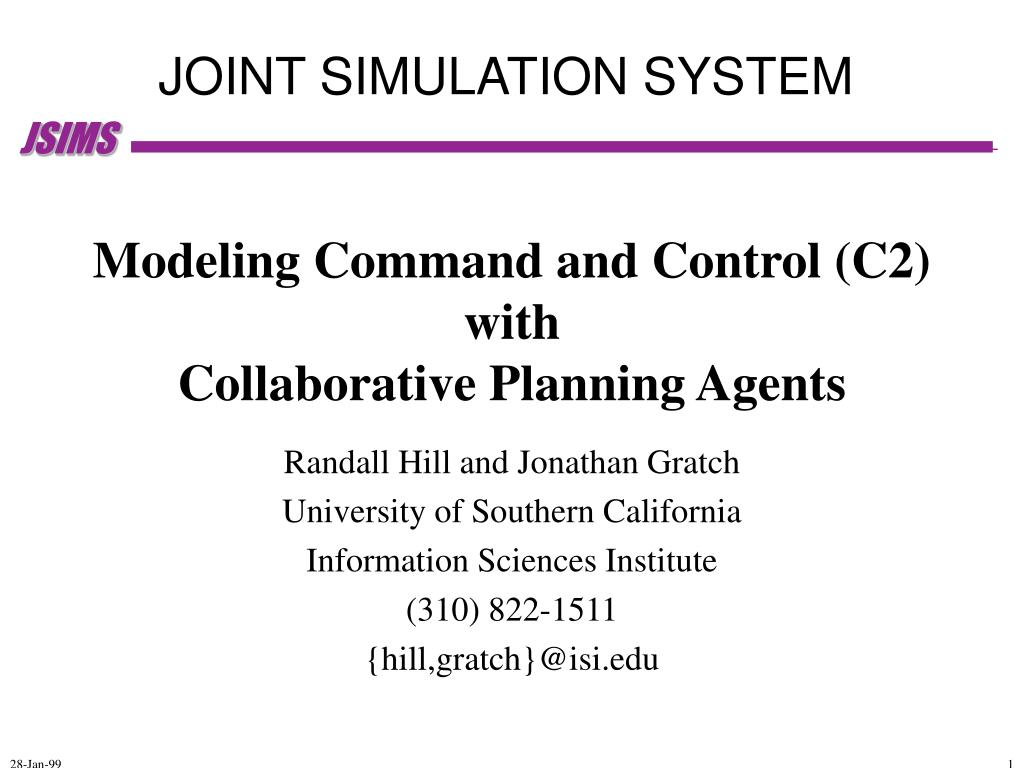 Modeling Command and Control (C2) with Collaborative Planning Agents JOINT SIMULATION SYSTEM Randall Hill and Jonathan Gratch University of Southern California Information Sciences Institute (310) 822-1511 {hill,gratch}@isi.edu 28-Jan-99 1