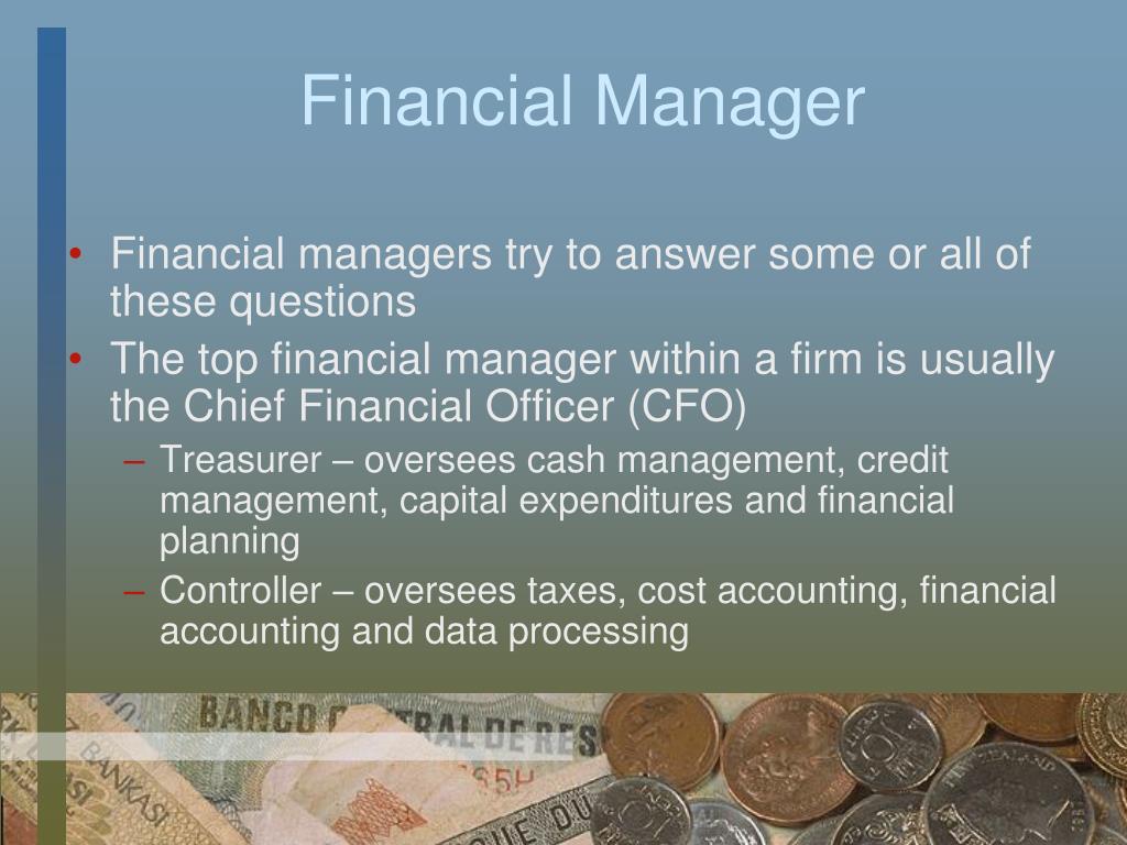 Financial Manager • Financial managers try to answer some or all of these questions • The top financial manager within a firm is usually the Chief Financial Officer (CFO) • Treasurer – oversees cash management, credit management, capital expenditures and financial planning • Controller – oversees taxes, cost accounting, financial accounting and data processing