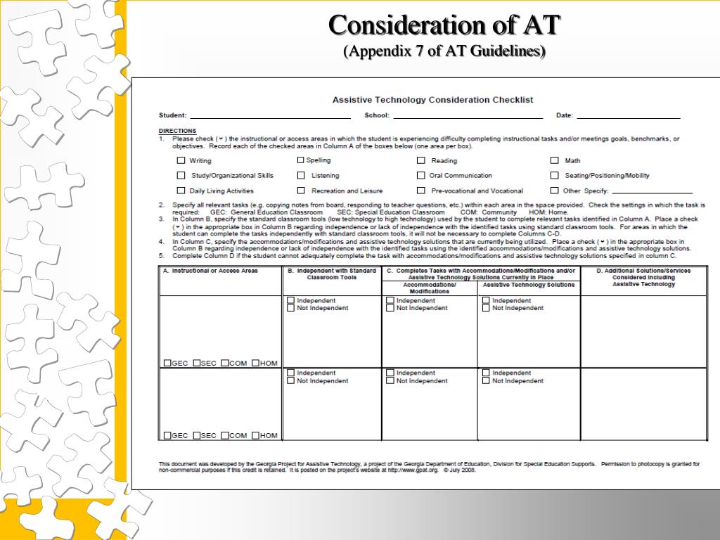 Consideration of AT • Consideration of AT prior to Evaluation • Process begins with the PPT/IEP team reviewing information about the student • Issues that a student may have in accessing the curriculum, and participation in and progress toward completing educational goals • Who can complete the Consideration Checklist