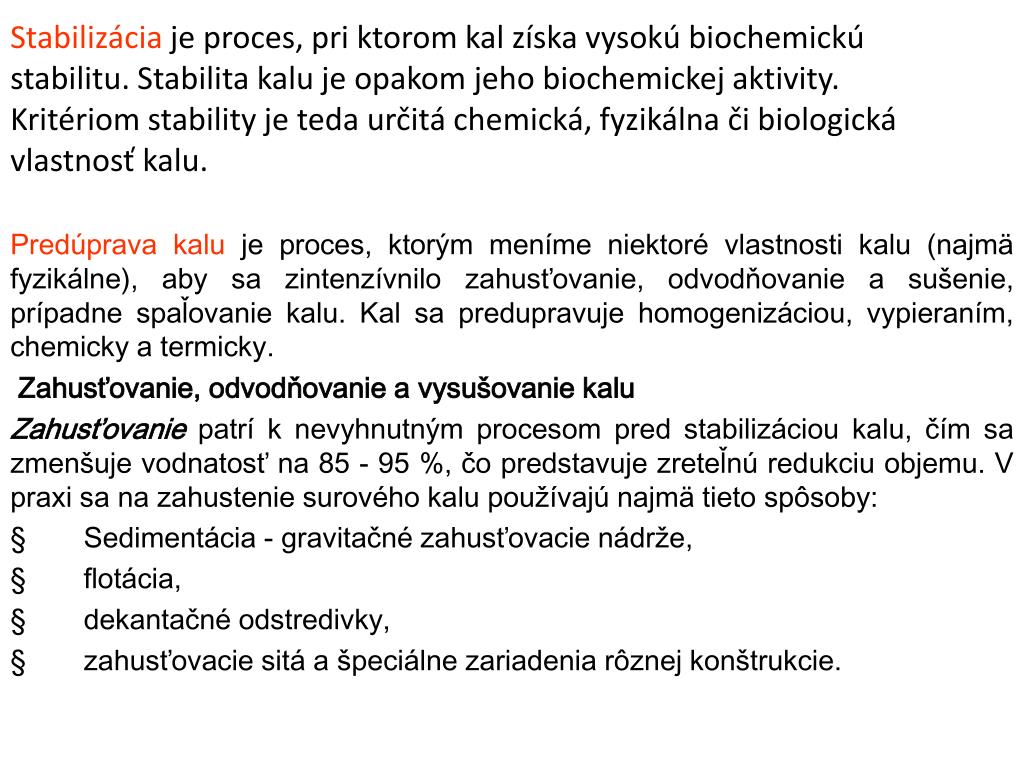 Stabilizácia je proces, pri ktorom kal získa vysokú biochemickú stabilitu. Stabilita kalu je opakom jeho biochemickej aktivity. Kritériom stability je teda určitá chemická, fyzikálna či biologická vlastnosť kalu. Predúprava kalu je proces, ktorým meníme niektoré vlastnosti kalu (najmä fyzikálne), aby sa zintenzívnilo zahusťovanie, odvodňovanie a sušenie, prípadne spaľovanie kalu. Kal sa predupravuje homogenizáciou, vypieraním, chemicky a termicky. Zahusťovanie, odvodňovanie a vysušovanie kalu Zahusťovanie patrí k nevyhnutným procesom pred stabilizáciou kalu, čím sa zmenšuje vodnatosť na 85 - 95 %, čo predstavuje zreteľnú redukciu objemu. V praxi sa na zahustenie surového kalu používajú najmä tieto spôsoby: §Sedimentácia - gravitačné zahusťovacie nádrže, §flotácia, §dekantačné odstredivky, §zahusťovacie sitá a špeciálne zariadenia rôznej konštrukcie.