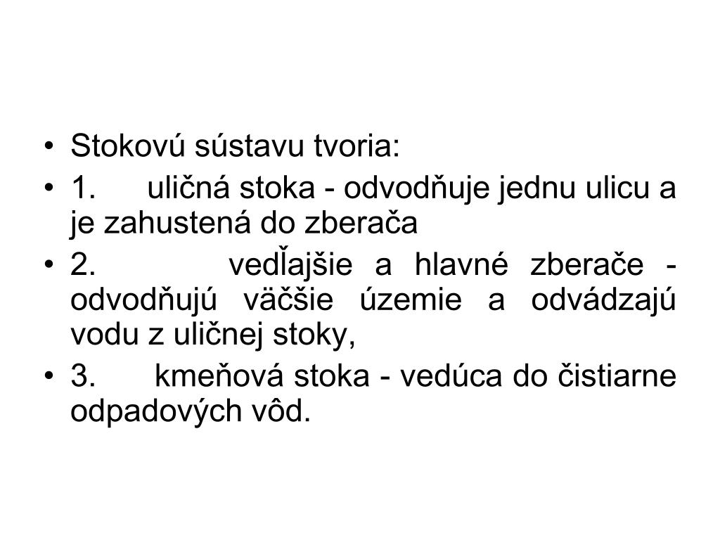 Stokovú sústavu tvoria: • 1.uličná stoka - odvodňuje jednu ulicu a je zahustená do zberača • 2.vedľajšie a hlavné zberače - odvodňujú väčšie územie a odvádzajú vodu z uličnej stoky, • 3.kmeňová stoka - vedúca do čistiarne odpadových vôd.