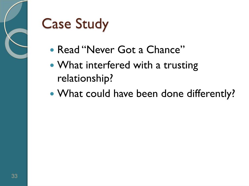 Case Study Read “Never Got a Chance” What interfered with a trusting relationship? What could have been done differently?