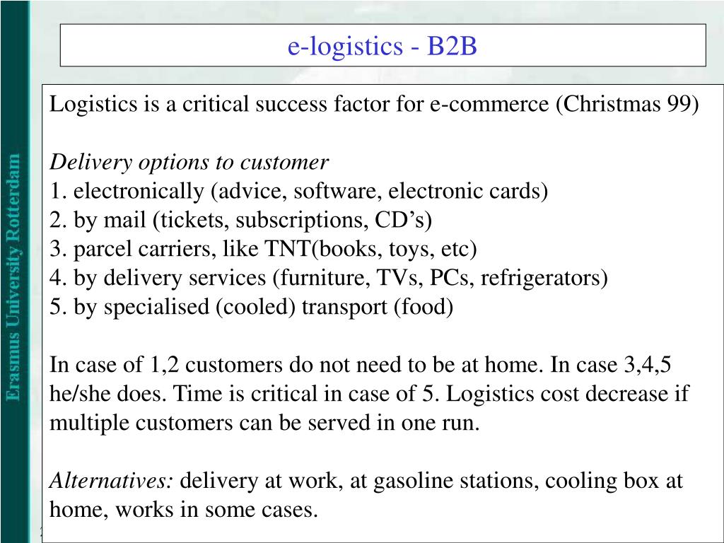 Logistics is a critical success factor for e-commerce (Christmas 99) Delivery options to customer 1. electronically (advice, software, electronic cards) 2. by mail (tickets, subscriptions, CD’s) 3. parcel carriers, like TNT(books, toys, etc) 4. by delivery services (furniture, TVs, PCs, refrigerators) 5. by specialised (cooled) transport (food) In case of 1,2 customers do not need to be at home. In case 3,4,5 he/she does. Time is critical in case of 5. Logistics cost decrease if multiple customers can be served in one run. Alternatives: delivery at work, at gasoline stations, cooling box at home, works in some cases. e-logistics - B2B