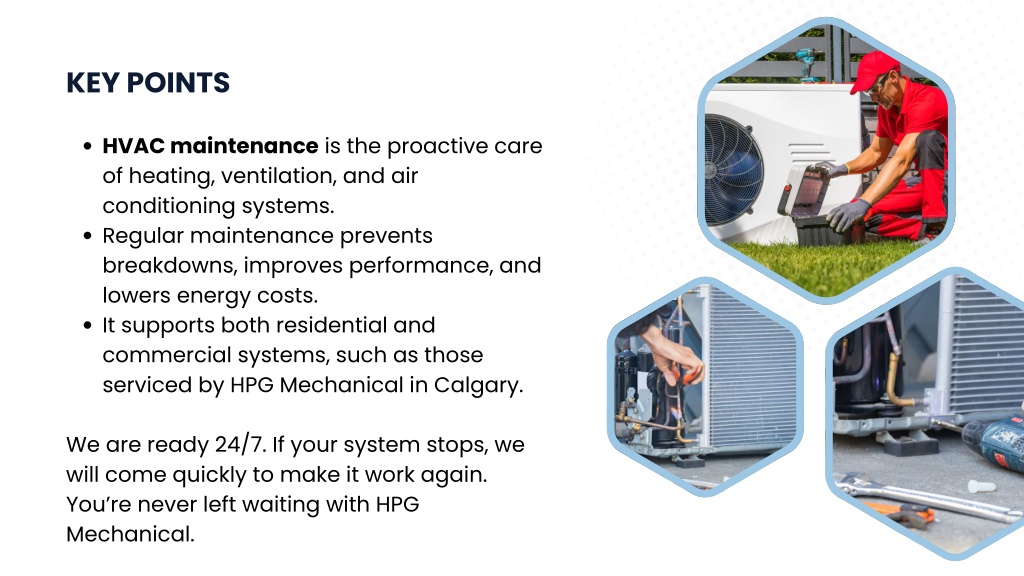 KEY POINTS HVAC maintenance is the proactive care of heating, ventilation, and air conditioning systems. Regular maintenance prevents breakdowns, improves performance, and lowers energy costs. It supports both residential and commercial systems, such as those serviced by HPG Mechanical in Calgary. We are ready 24/7. If your system stops, we will come quickly to make it work again. You’re never left waiting with HPG Mechanical.