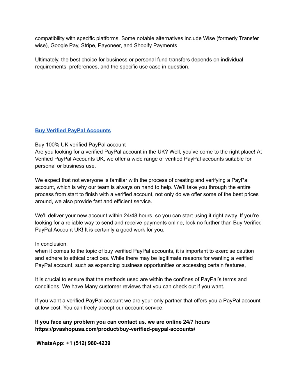 compatibility with specific platforms. Some notable alternatives include Wise (formerly Transfer wise), Google Pay, Stripe, Payoneer, and Shopify Payments Ultimately, the best choice for business or personal fund transfers depends on individual requirements, preferences, and the specific use case in question. Buy Verified PayPal Accounts Buy 100% UK verified PayPal account Are you looking for a verified PayPal account in the UK? Well, you’ve come to the right place! At Verified PayPal Accounts UK, we offer a wide range of verified PayPal accounts suitable for personal or business use. We expect that not everyone is familiar with the process of creating and verifying a PayPal account, which is why our team is always on hand to help. We’ll take you through the entire process from start to finish with a verified account, not only do we offer some of the best prices around, we also provide fast and efficient service. We’ll deliver your new account within 24/48 hours, so you can start using it right away. If you’re looking for a reliable way to send and receive payments online, look no further than Buy Verified PayPal Account UK! It is certainly a good work for you. In conclusion, when it comes to the topic of buy verified PayPal accounts, it is important to exercise caution and adhere to ethical practices. While there may be legitimate reasons for wanting a verified PayPal account, such as expanding business opportunities or accessing certain features, It is crucial to ensure that the methods used are within the confines of PayPal’s terms and conditions. We have Many customer reviews that you can check out if you want. If you want a verified PayPal account we are your only partner that offers you a PayPal account at low cost. You can freely accept our account service. If you face any problem you can contact us. we are online 24/7 hours https://pvashopusa.com/product/buy-verified-paypal-accounts/ WhatsApp: +1 (512) 980-4239