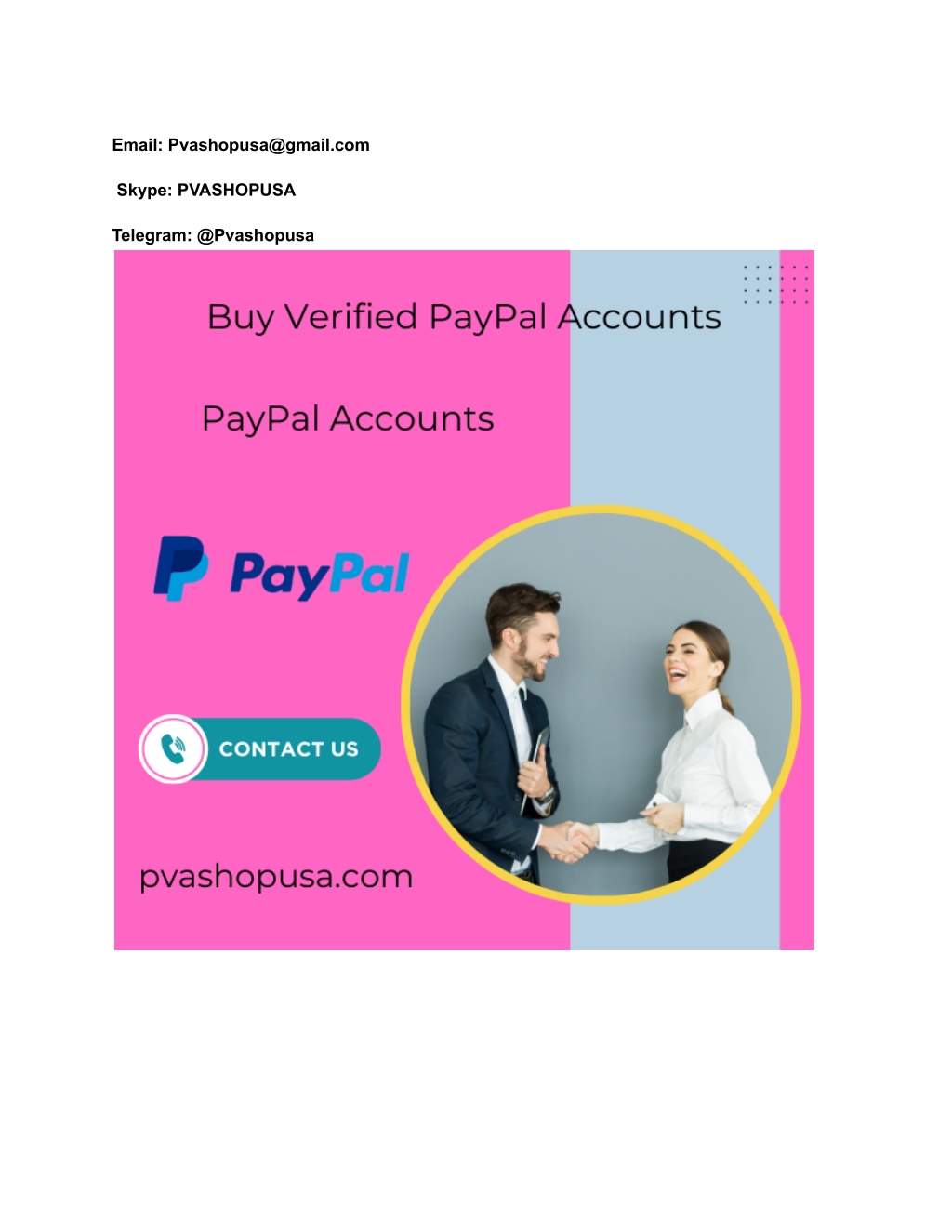 Buy Verified PayPal Accounts Buy verified PayPal account PayPal gives you the ability to accept payments in multiple currencies and in multiple countries, making it easy for international customers to shop from your website or online store. Pvashopusa team provide top quality verified PayPal Accounts Worldwide at low prices. ID, Driving License, and Bank, SNN, Verified Accounts. Documents provided in PayPal accounts- ✔ SNN Card Details ✔ Email Login ✔ Bank Login access ✔ Driving license verified ✔ Valid Photo Id/Driving license ✔ 24/7 free customer service. If you face any problem you can contact us. we are online 24/7 hours https://pvashopusa.com/product/buy-verified-paypal-accounts/ WhatsApp: +1 (512) 980-4239 Email: Pvashopusa@gmail.com Skype: PVASHOPUSA Telegram: @Pvashopu