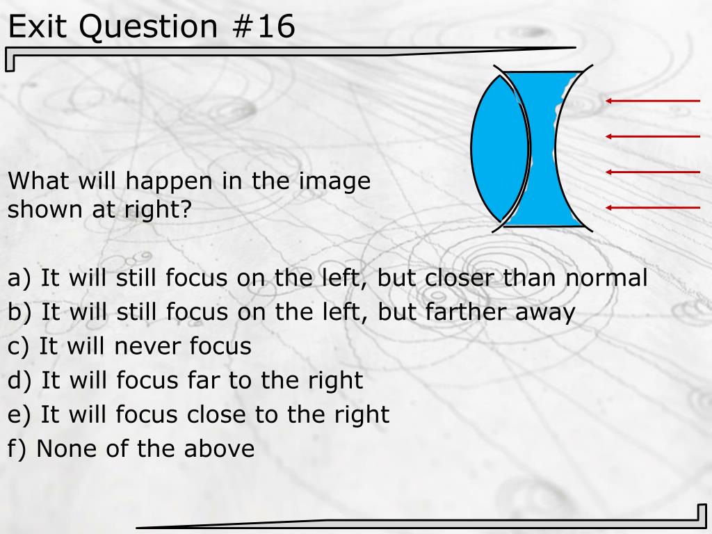 Exit Question #16 What will happen in the imageshown at right? a) It will still focus on the left, but closer than normal b) It will still focus on the left, but farther away c) It will never focus d) It will focus far to the right e) It will focus close to the right f) None of the above