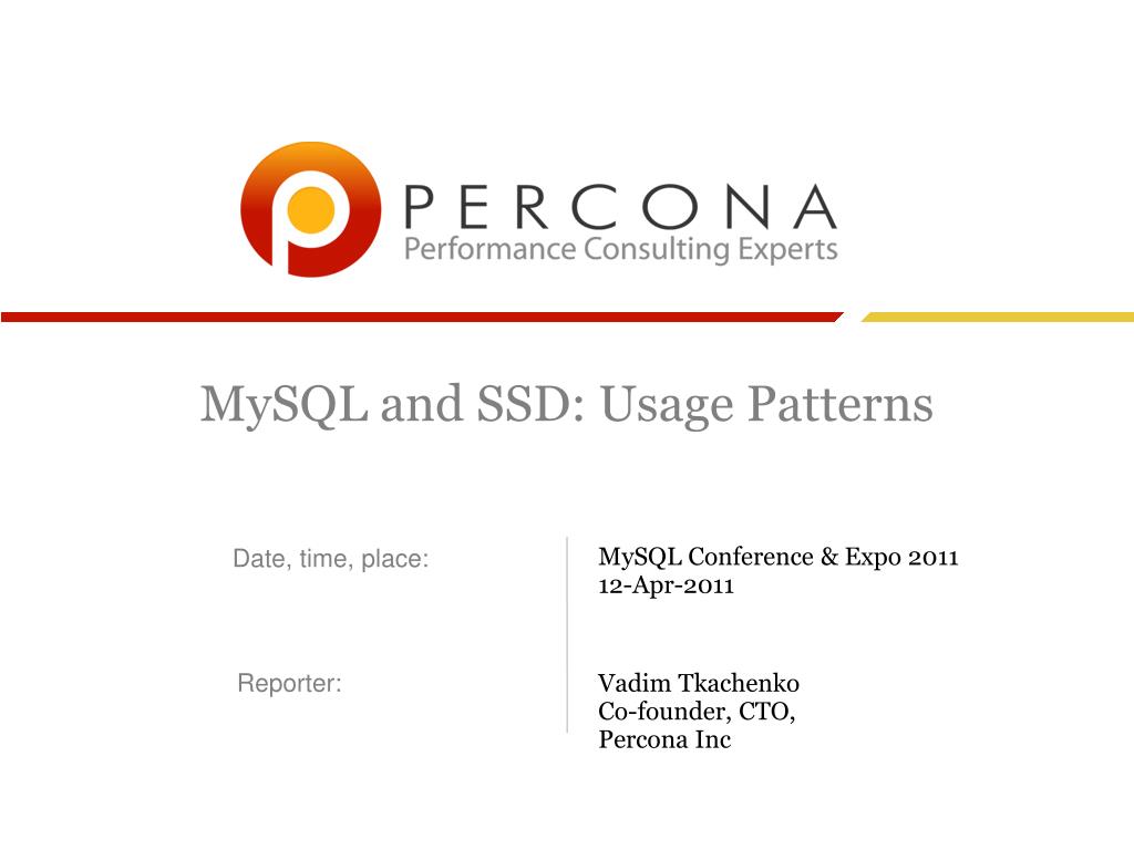 MySQL and SSD: Usage Patterns. MySQL Conference & Expo 2011 12-Apr-2011. Date, time, place:. Reporter:. Vadim Tkachenko Co-founder, CTO, Percona Inc. You can get up to 7x gain running MySQL on SSD Even 20x with some tricks. In this talk.