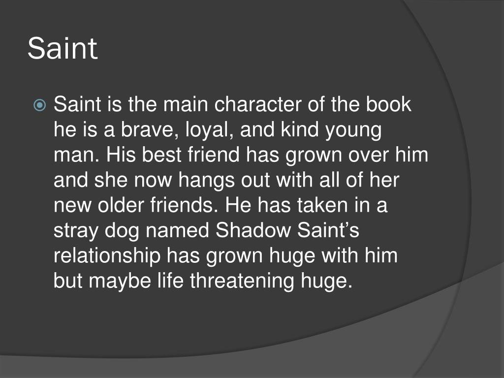 Saint • Saint is the main character of the book he is a brave, loyal, and kind young man. His best friend has grown over him and she now hangs out with all of her new older friends. He has taken in a stray dog named Shadow Saint’s relationship has grown huge with him but maybe life threatening huge.