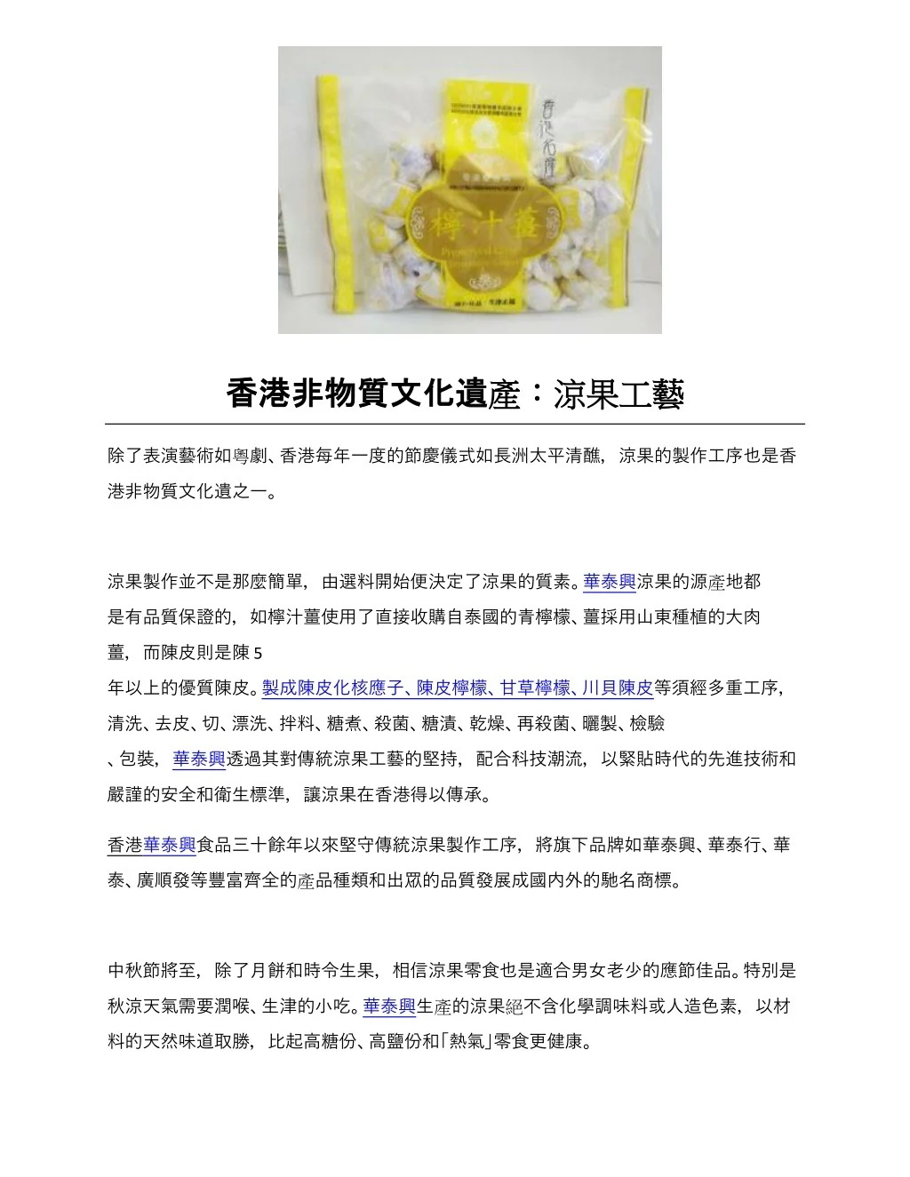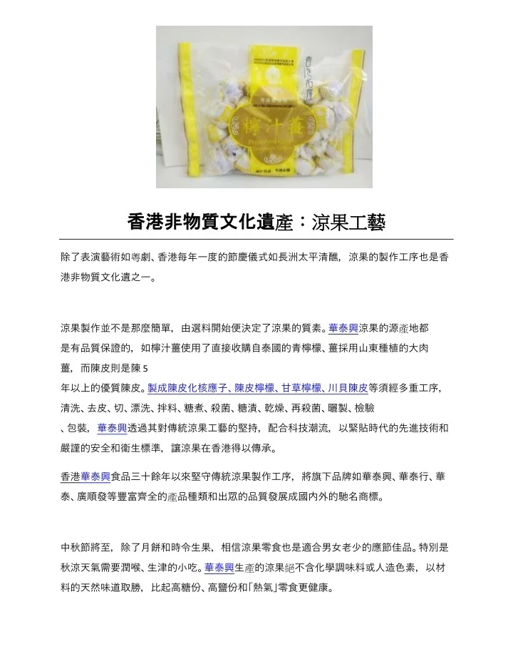 香港非物質文化遺 香港非物質文化遺產:涼果工藝 產:涼果工藝 除了表演藝術如粵劇、香港每年一度的節慶儀式如長洲太平清醮,涼果的製作工序也是香 港非物質文化遺之一。 涼果製作並不是那麼簡單,由選料開始便決定了涼果的質素。華泰興涼果的源產地都 是有品質保證的,如檸汁薑使用了直接收購自泰國的青檸檬、薑採用山東種植的大肉 薑,而陳皮則是陳 5 年以上的優質陳皮。製成陳皮化核應子、陳皮檸檬、甘草檸檬、川貝陳皮等須經多重工序, 清洗、去皮、切、漂洗、拌料、糖煮、殺菌、糖漬、乾燥、再殺菌、曬製、檢驗 、包裝,華泰興透過其對傳統涼果工藝的堅持,配合科技潮流,以緊貼時代的先進技術和 嚴謹的安全和衛生標準,讓涼果在香港得以傳承。 香港華泰興食品三十餘年以來堅守傳統涼果製作工序,將旗下品牌如華泰興、華泰行、華 泰、廣順發等豐富齊全的產品種類和出眾的品質發展成國内外的馳名商標。 中秋節將至,除了月餅和時令生果,相信涼果零食也是適合男女老少的應節佳品。特別是 秋涼天氣需要潤喉、生津的小吃。華泰興生產的涼果絕不含化學調味料或人造色素,以材 料的天然味道取勝,比起高糖份、高鹽份和「熱氣」零食更健康。